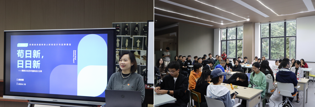 其次,活动特别邀请邀请第三批“全国高校黄大年式教师团队”成员之一庞君薇副教授以“巴蜀绣色绽千年——蜀绣的艺术特点及传承创新“为题开展文化素质讲座。在讲座中,她介绍了蜀绣的独特针法和色彩运用,展示了这一传统手工艺的精湛技艺和美学价值。同时她介绍了成都纺织高等专科学校创新性地构建了“教授+大师”的教学模式,通过设立“研究中心+大师工作室”,积极探索“蜀绣与时尚结合”的非遗传承教育新模式。凭借其在纺织领域的独特优势和人才培养能力,学校大力推进非物质文化遗产蜀绣的传承与发展项目,旨在建立一个符合新时代需求的蜀绣技艺传承者培养体系,激发蜀绣保护与传承的新活力,也为蜀绣文化的创新发展指明了方向、注入了动力。