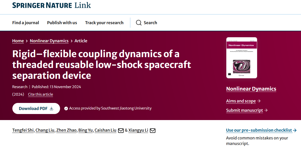 近日,西南交通大学李翔宇教授课题组在航天器机构动力学方面取得进展,相关成果以“Rigid-flexible coupling dynamics of a threaded reusable low-shock spacecraft separation device”为题发表在动力学领域期刊《Nonlinear Dynamics》。西南交通大学石腾飞博士后为第一作者,西南交通大学李翔宇教授和北京大学刘才山教授为共同通讯作者,合作作者包括西南交通大学刘畅讲师、北京航空航天大学赵振教授,以及中国运载火箭技术研究院余兵高级工程师。论文详细信息见图1,论文链接:https://link.springer.com/article/10.1007/s11071-024-10591-1