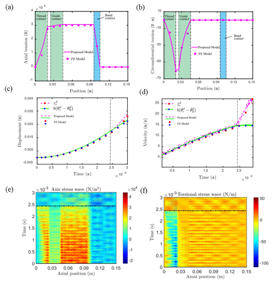 基于所发展的模型,如图5所示,分析了分离前螺杆(a)拉力和(b)扭矩分布特征; 分离过程中螺杆平移旋转(c)位移和(d)速度的演化规律, 以及(e)拉伸应力波和(f)扭转应力波的传播。仿真结果和有限元计算结果一致,展现了模型的精确性。