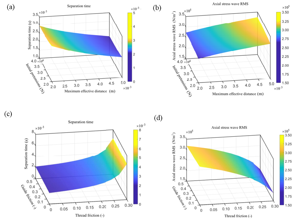 通过系列仿真,研究了外部驱动载荷和内部摩擦等参数对分离时间和冲击强度等动力学响应的影响规律。如图6所示,发现分离时间随着包带预拉力增大、作用行程增大而减小,随着摩擦系数增大而增大,其中螺纹接触摩擦影响远大于导向摩擦接触影响。此外,分离时间越短,冲击强度越大。