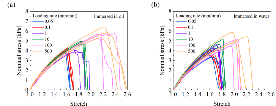 图2. PAAm水凝胶的速率依赖性断裂:(a)油浴;(b)水浴