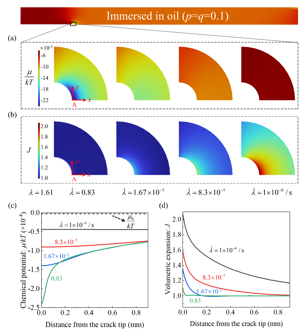 图4. 油环境中裂纹尖端的化学势场与溶胀场分布