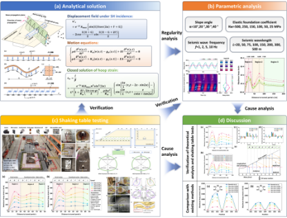 本研究根据波动力学原理,考虑地震波的反射和衰减效应,采用射线理论推导SH波垂直入射下隧道洞口段位移波场,然后建立弹性地基梁模型,考虑隧道与围岩的相互作用,获得隧道各处的应变封闭解(图2a)。通过参数分析,探讨了仰坡坡角、地震波长、地震频率和弹性地基系数等对隧道动力响应的影响(图2b)。研究指出隧道拱脚与拱肩应变响应较剧烈,是抗震设计的关键部位。隧道洞口段受地震影响的区域可划分为强烈影响区(0~3D,D为隧道洞径)、一般影响区(3~7.5D)和未受影响区(>7.5D),推荐的隧道洞口抗震加固范围为隧道洞径的7.5倍。