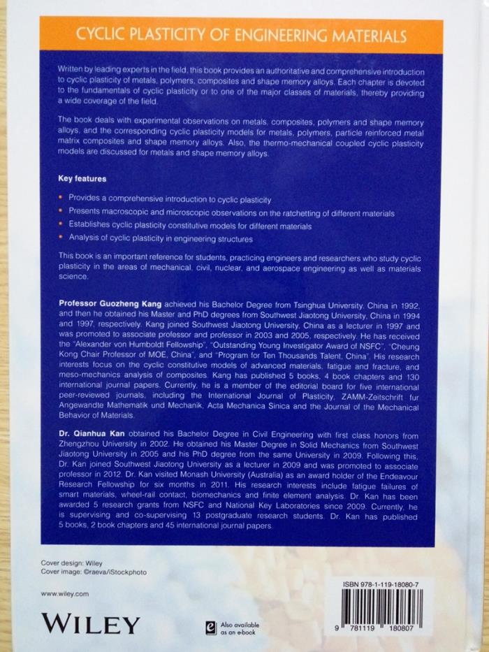 近日,西南交通大学力学与工程学院康国政教授与阚前华副教授受邀由John Wiley & Sons Ltd公司出版了英文专著“Cyclic plasticity of Engineering Materials: Experiments and models”,分七个章节,共538页(ISBN: 9781119180807)。