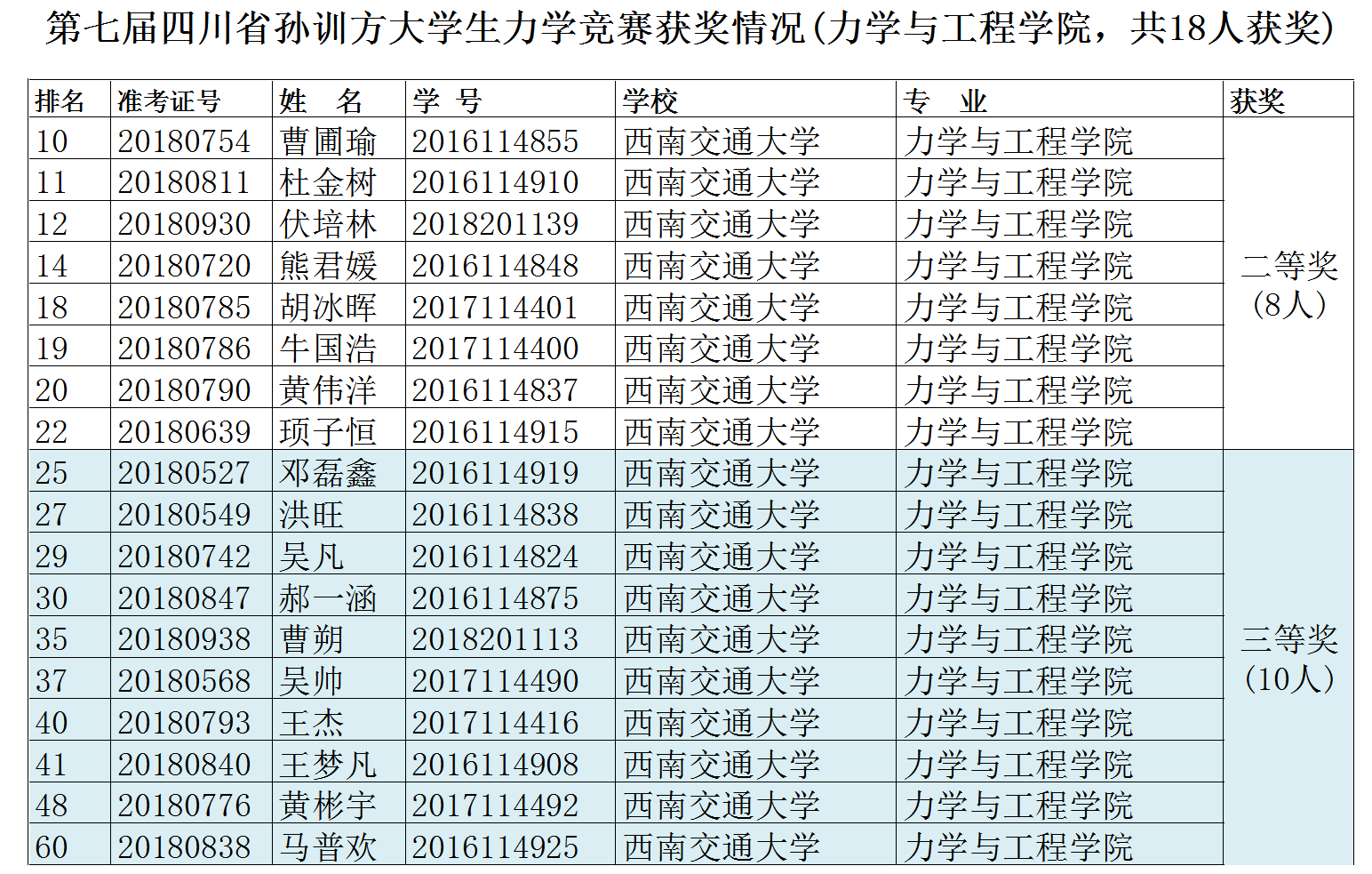 2018年12月1日,由四川省力学学会主办,西南交通大学教务处和力学与工程学院共同承办的第七届四川省孙训方大学生力学竞赛在我校犀浦校区2号教学楼举行。本项赛事每两年举办一次,经过赛前的周密部署和宣传,竞赛得到四川省内高校的积极响应,参加高校包括西南交通大学、四川大学、成都理工大学、西南石油大学、西华大学、西南科技大学、四川理工大学等20个单位。本届赛事首次将高职高专作为独立参赛群体单独命题进行竞赛,其中,本科及以上层次有14个院校参赛,共1370名参赛学生,创历史新高;高职高专有9个院校参赛,共184名学生参赛。西南交通大学组织安排了12个本科及以上层次考场、2个高职高专考场,四川大学江安校区安排了5个本科及以上层次考场。西南交通大学和四川大学参赛学生最多,分别为477名和367名。