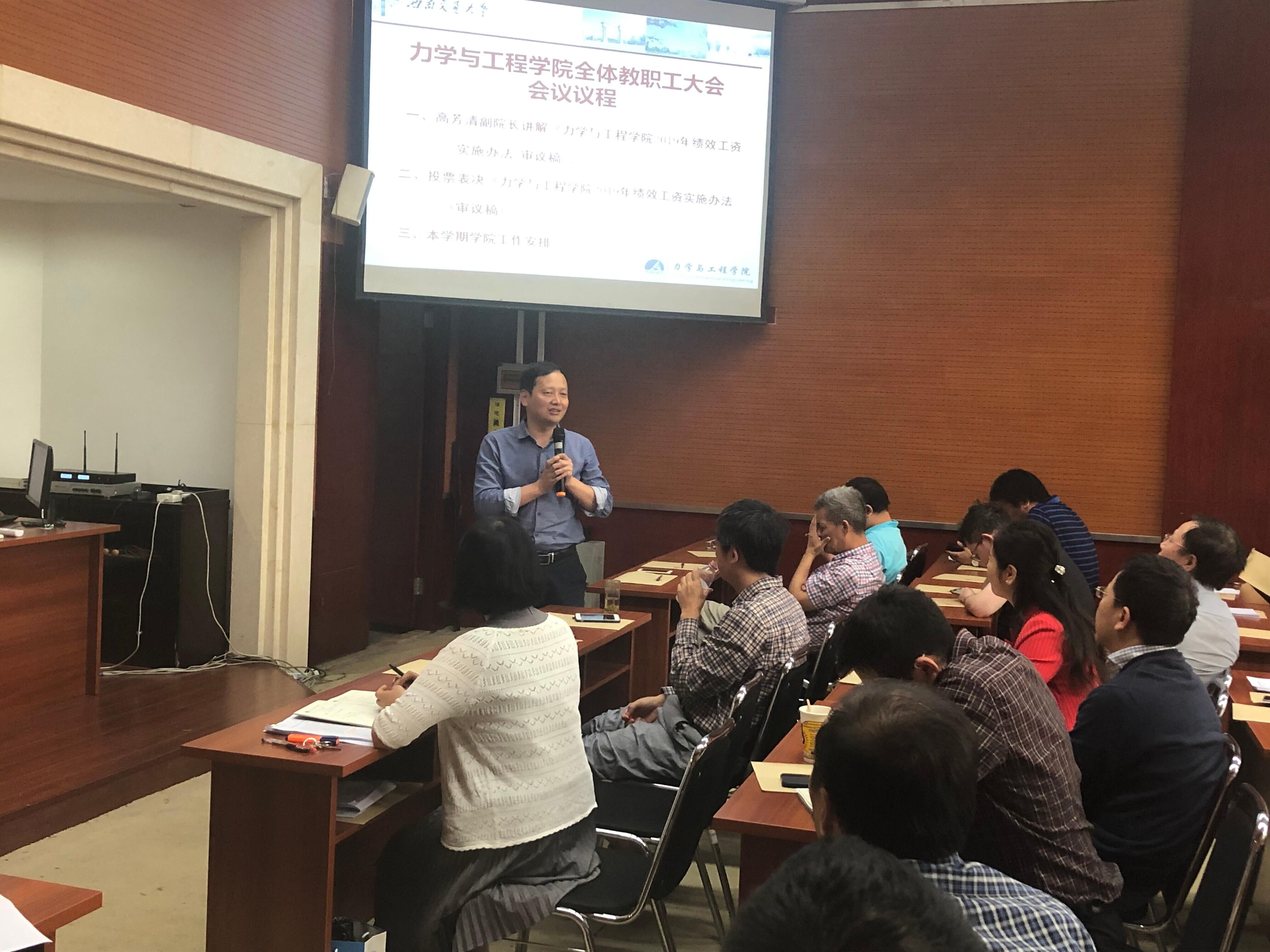 在接下来的会议中,高芳清副院长对近期学院教学团队工作室使用情况进行了通报和要求。阚前华副院长介绍了“力学拔尖班”报名情况和研究生招生、教学的相关工作安排。李翔宇副院长通报了近期相关学术会议、自然科学基金、“创源大讲堂”等工作的进展情况。工会主席范晨光通报了近期学院歌咏比赛、植树活动等工作安排。