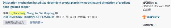 力学与工程学院张旭副教授指导博士研究生陆晓翀于2019年2月在固体力学领域重要TOP期刊《International Journal of Plasticity》上发表题为“Dislocation mechanism based size-dependent crystal plasticity modeling and simulation of gradient nano-grained copper”的学术论文。博士生陆晓翀为第一作者,张旭副教授为通讯作者,西南交通大学力学与工程学院为第一署名单位。该论文凭借原创性和研究价值,于2019年11月底入选ESI高被引论文。