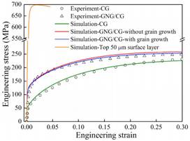 梯度纳米结构材料是近年来兴起的一种特殊材料,具备良好的强度、硬度、加工硬化能力、延展性和抗疲劳性能。为了更好地发展和应用梯度纳米结构材料,需要预测不同梯度结构材料的力学性能,从而进行微结构优化设计。该研究建立了基于复杂位错演化机制的尺寸相关晶体塑性本构模型,并引入了晶粒长大机制和损伤演化模型。有限元模拟结果表明,该模型可以很好地描述材料的单拉力学行为与梯度微结构的关联。根据变形云图分析,表层纳米晶的晶粒长大机制可以有效缓解应力的不均匀分布,协调塑性变形,使得材料表层不容易发生应变局域化,延缓了颈缩的发生。损伤演化云图表明,损伤起始于粗晶区,逐渐扩展到梯度区,表层纳米晶由于高强度,使得损伤很难发生。