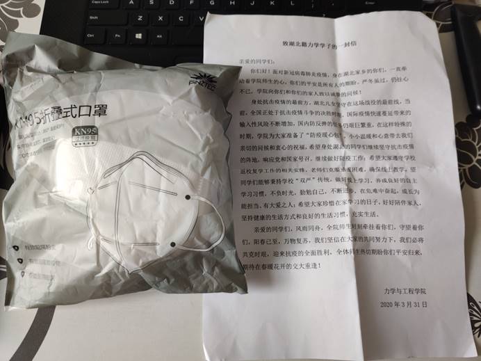 41日,学院为30名湖北籍学生寄送“防疫暖心包”,包裹里不仅有防疫物品,还有一封写给湖北学子们的信。在信中,学院向湖北同学致以诚挚的问候,表达了浓浓的思念与牵挂,让他们感受到了来自学院的温暖,给了大家战胜疫情的勇气和信心。