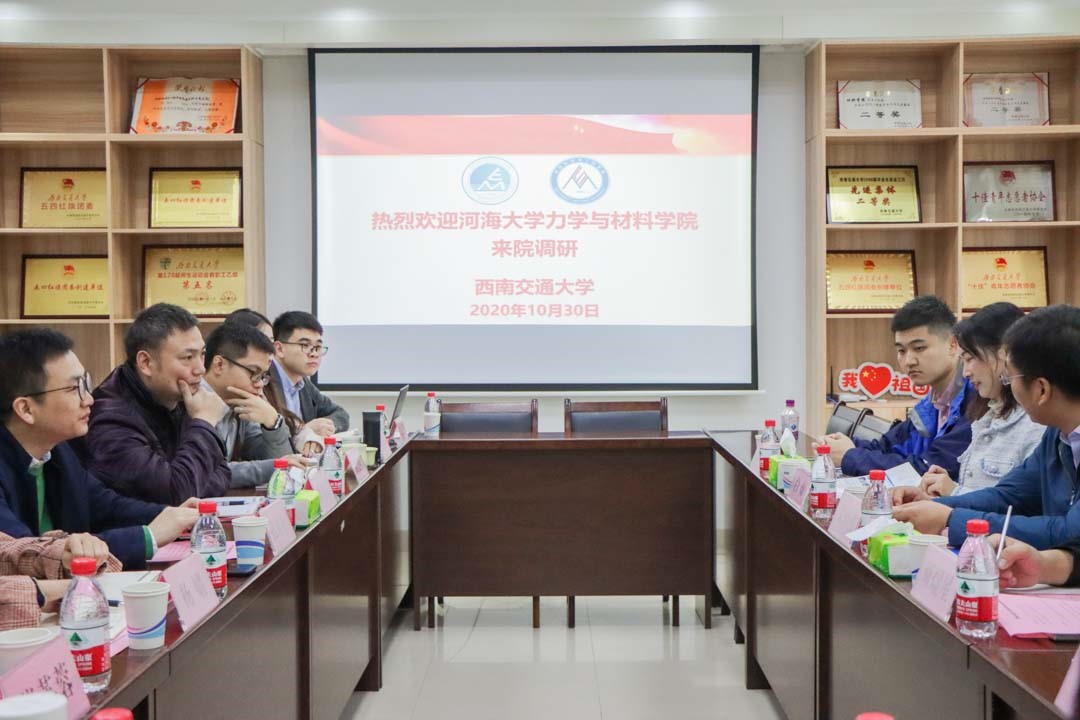 10月30日上午,河海大学力学与材料学院党委副书记朱倬然一行来到西南交通大学,到力学与工程学院和材料科学与工程学院开展调研交流。力学学院党委副书记孔祥彬、材料学院党委副书记章春军带领两院学生工作组老师们与河海大学力材学院在X2128会议室展开了热烈的交流。