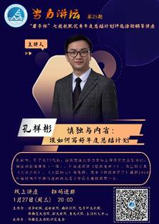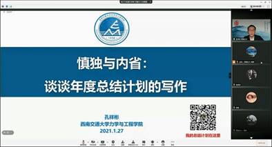 2021年1月27日20:00,力学与工程学院党委副书记、君子(虚拟)书院负责人、学校“青年讲师团”成员孔祥彬老师受邀做客“努力讲坛”第二十五期,讲座主题为“慎独与自省---谈如何写好年度总结计划”。本次讲座由力学与工程学院研究生会承办,是“君子杯”七校航院优秀年度总结计划评选活动第一次辅导讲座,来自西南交通大学、清华大学、浙江大学、北京航空航天大学、南京航空航天大学、电子科技大学、重庆大学等十多所高校400余名师生参加了本次讲座。