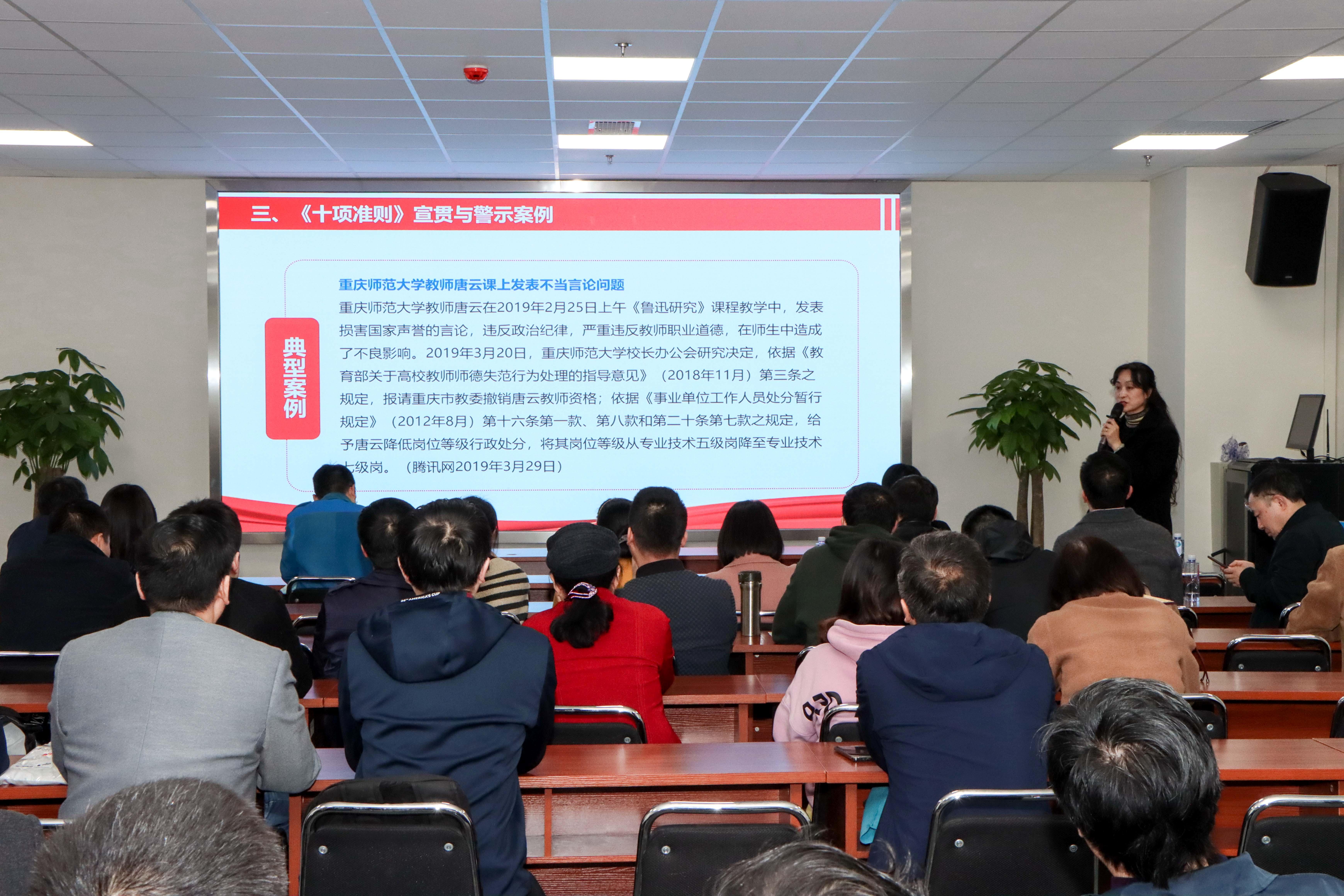 随后,党委教工部李菁副部长为大家进行了一场题目为:高校师德师风建设与警示案例宣讲的教育讲座。李菁副部长从新时代对教师和师德师风建设的要求;学校师德师风建设开展情况;《十项准则》宣贯与警示案例三个方面给教职工讲述了一场鲜活的师德师风讲座,现场教职工深受教育,反响强烈。