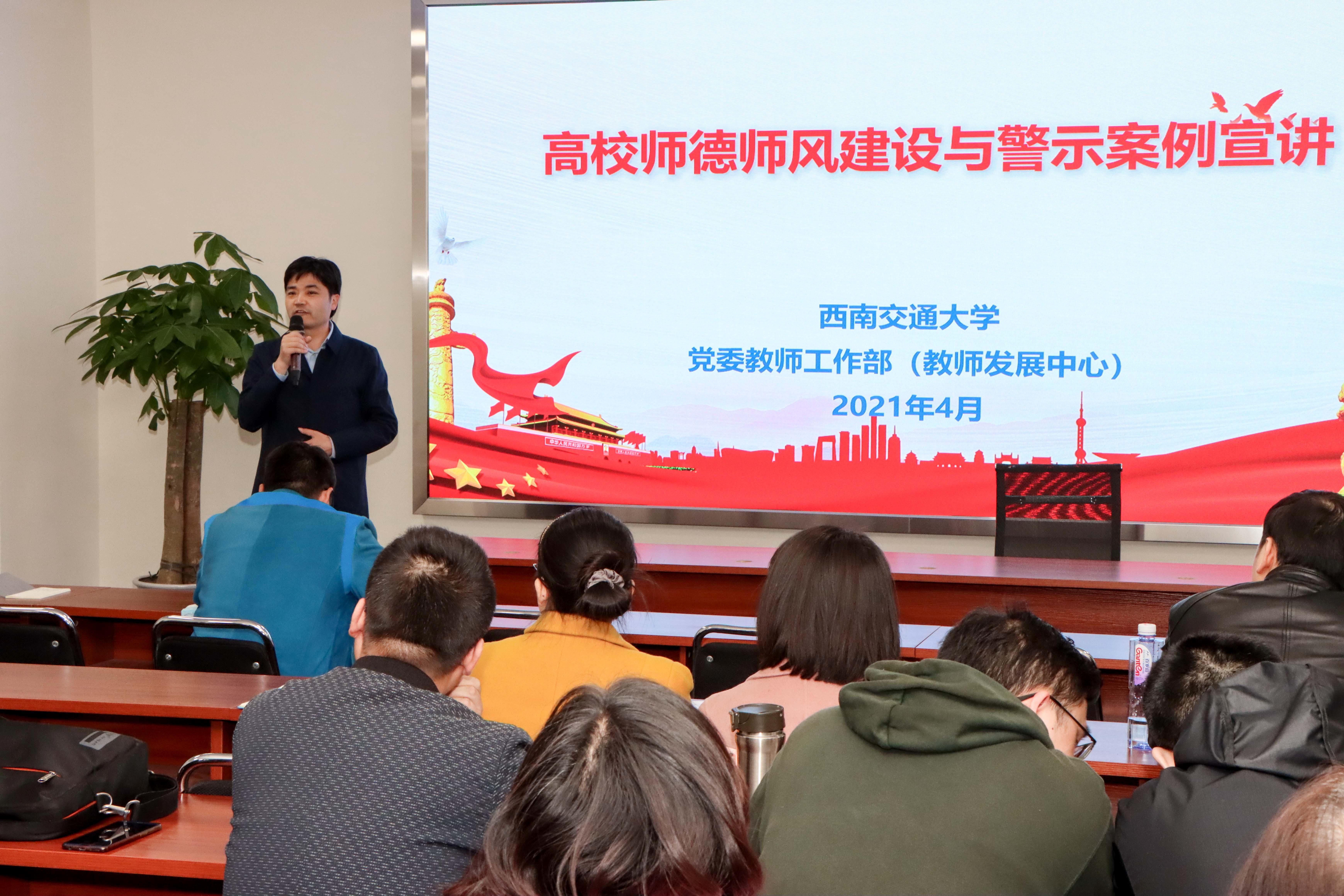 接下来,苏谦部长对学校党委教师工作部的发展和职能向全院教职工进行了简单的介绍。西南交通大学党委教师工作部成立于2017年2月,是国内最早成立的党委教师工作部之一,教工部率先尝试教师思政与教师发展工作紧密结合,探索创新“五个结合”的教师思政工作新模式,职能上着力加强教师思想政治工作,整合了原属于校工会的师德师风、新教师入职教育、教师教学竞赛以及人事处有关教师国内外研修访学、学历提升、教师资格及语言文字等业务性工作。
