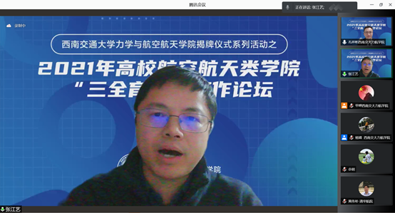 2021年12月4日下午14:30,作为565net必赢客户端揭牌仪式系列活动之一,2021年高校航空航天类学院“三全育人”工作论坛成功举办。565net必赢客户端党委书记栗民致欢迎词,565net必赢客户端党委副书记孔祥彬、清华大学航天航空学院党委副书记黄伟希、南京航空航天大学航空学院党委副书记佘明、北京航空航天大学宇航学院党委副书记赵青、华中科技大学航空航天学院党委副书记宋建涛先后做了主题报告,教育部中国大学生在线常务副主任、全国高校思政网常务副主任张江艺做了总结点评。论坛通过腾讯会议线上形式举行,除了五校航院老师外,还有来自哈工大、西北工大、四川大学、大连理工、郑州大学等校200余名教师参加了论坛,论坛由孔祥彬主持。