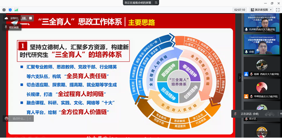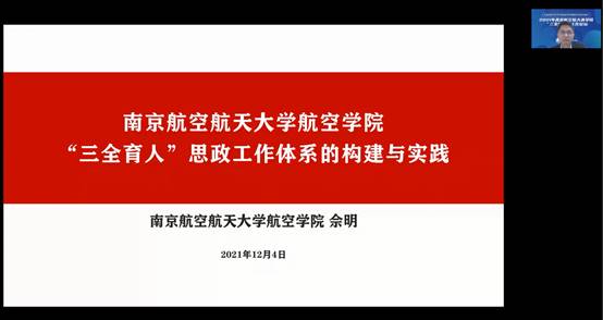 南京航空航天大学佘明作了题为“学院‘三全育人’思政工作体系的构建与实践”的报告,介绍了学院面向航空工业发展的战略需求,汇聚一流学科、一流师资、一流平台、一流企业等校内外优势教育资源,构建和实施了“三全育人”视角下育人过程协同、育人主体协同、育人平台协同的“三协同”人才培养新体系的创新做法和积极成效。