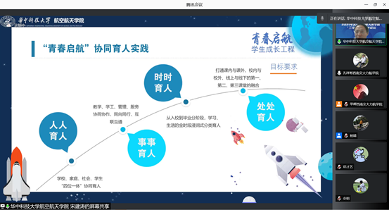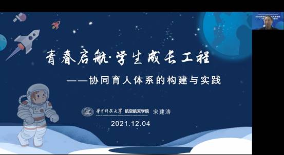 华中科技大学宋建涛作了题为“青春启航•学生成长工程协同育人体系的构建与实践”的报告,介绍了学院通过“思想引航、专业领航、行业导航、组织护航”四位一体协同育人体系,着力培养学生深厚家国情怀和空天报国使命、扎实专业知识和终身学习能力、较强创新意识和解决问题能力、良好团队合作和组织协调能力的具体做法和成效。