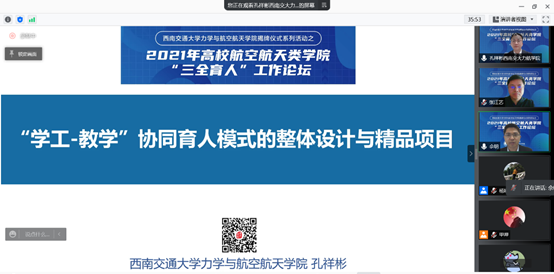 西南交通大学孔祥彬作了题为“学工教学协同育人模式的整体设计与精品项目”的报告,介绍了学院学工口和教学口通力协作,以课程为中心协同设计并开展的一系列“双严”文化传承活动、课程文化活动、学习支持活动、课外拓展活动,并重点分享了学生工作课程化、基础力学课程优秀作业笔记评选、七校航院大学生总结计划评选等精品项目的做法和成效。
