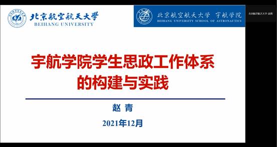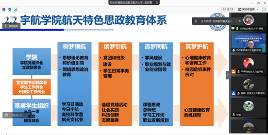 北京航空航天大学赵青作了题为“学院学生思政工作体系的构建与实践”的报告,介绍了学院围绕立德树人根本任务,通过构建“树梦领航、创梦引航、追梦同航、筑梦护航”工作体系,开展航天特色思政教育的具体做法和成效。