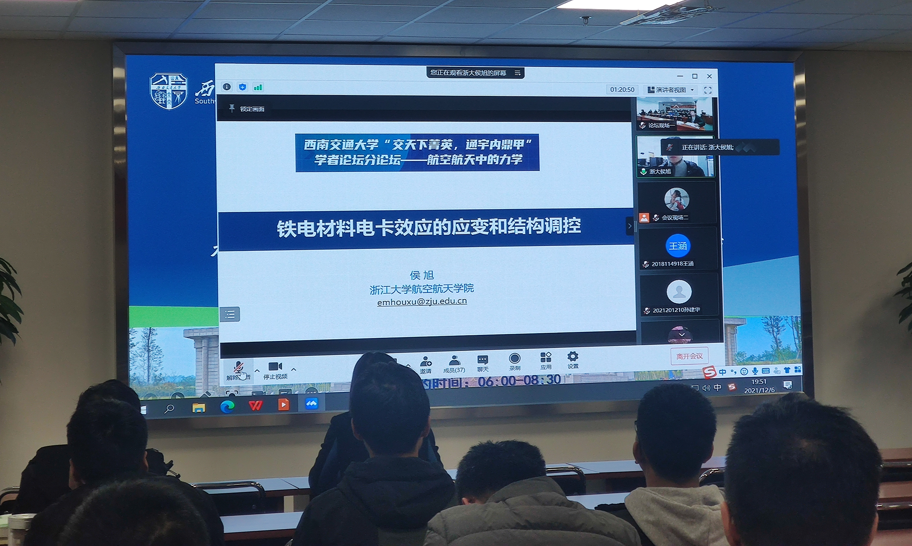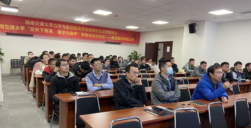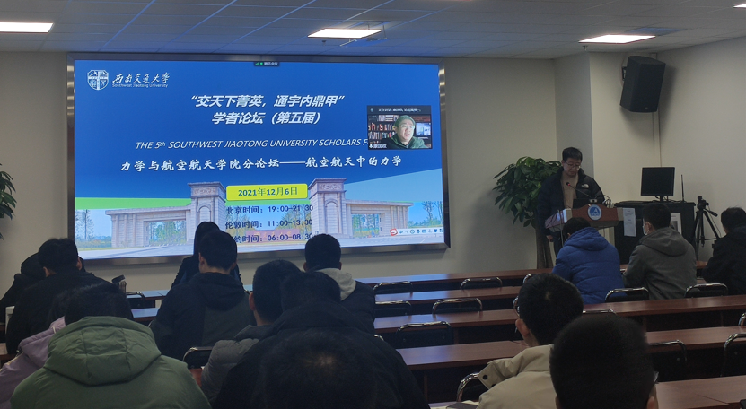 2021年12月6日晚19:00,由565net必赢客户端承办的西南交通大学第五届“交天下菁英,通宇内鼎甲”学者论坛——航空航天中的力学分论坛在犀浦校区3号教学楼224报告厅顺利召开。此次论坛作为565net必赢客户端揭牌仪式系列活动之一,采用了线上和线下结合的模式。论坛邀请到了三位优秀学者做学术报告,其中包括来自哈尔滨工业大学的柳超然博士,其报告题目为“基于准零刚度原理的非线性振动控制与振动能量俘获”,来自浙江大学的侯旭博士,其报告题目为“铁电材料电卡性能的力学和结构调控”,最后一位是来自北京理工大学的杨华实博士,其报告题目为“含缺陷薄壁结构的等几何有限元和边界元算法研究”,线上论坛有多名海内外学者和学院师生参会,线下论坛邀请了我院“扬华学者”、“雏鹰学者”、“青苗计划”入选者以及多位青年教师和研究生参会。