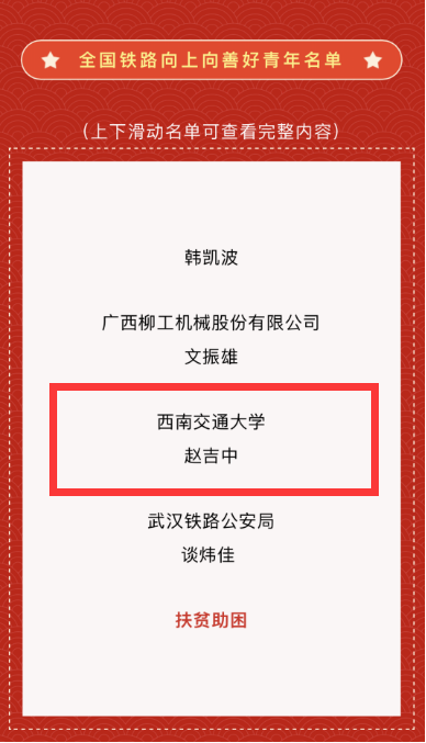 此次表彰中,565net必赢客户端博士研究生赵吉中荣获全国铁路向上向善好青年称号。