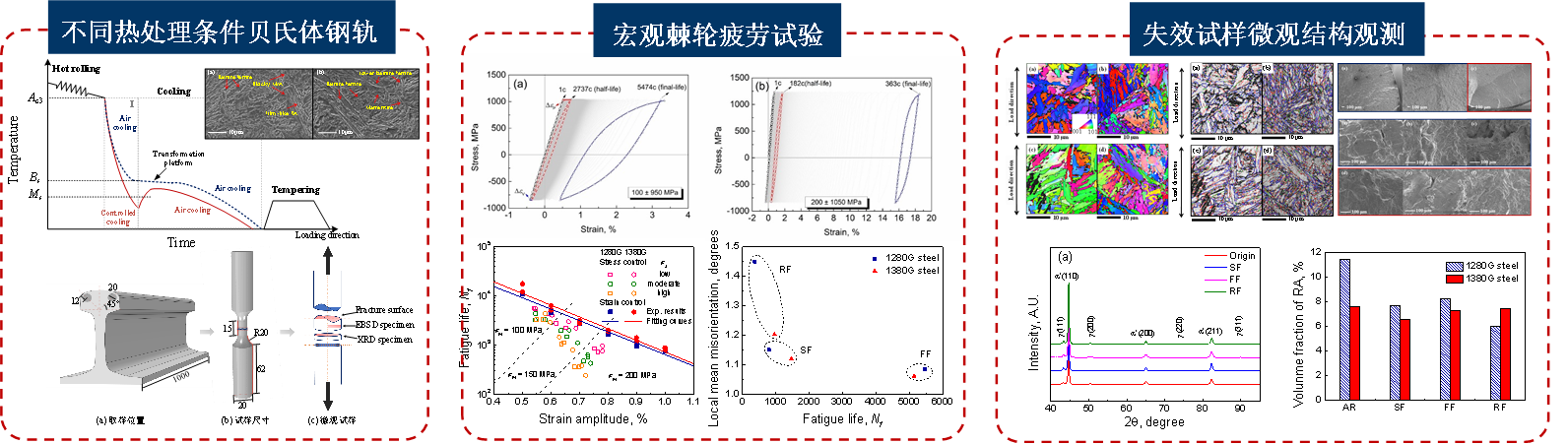 无碳化贝氏体钢轨在滚动接触疲劳载荷作用下多相组织发生动态演变,使得其疲劳损伤机理异常复杂,成为目前抗疲劳设计的关键科学难题。鉴于此,西南交通大学阚前华教授课题组针对两种不同热处理条件下的无碳化物贝氏钢轨钢开展了应变疲劳和应力疲劳试验,分别从宏、微观层面研究了微结构和残余奥氏体对棘轮疲劳交互作用的影响。结果表明无碳化物贝氏呈现出非饱和的应变幅相关的循环软化特性,稳定位错子结构的形成和块状残余奥氏体的转变促进了棘轮变形的演化。